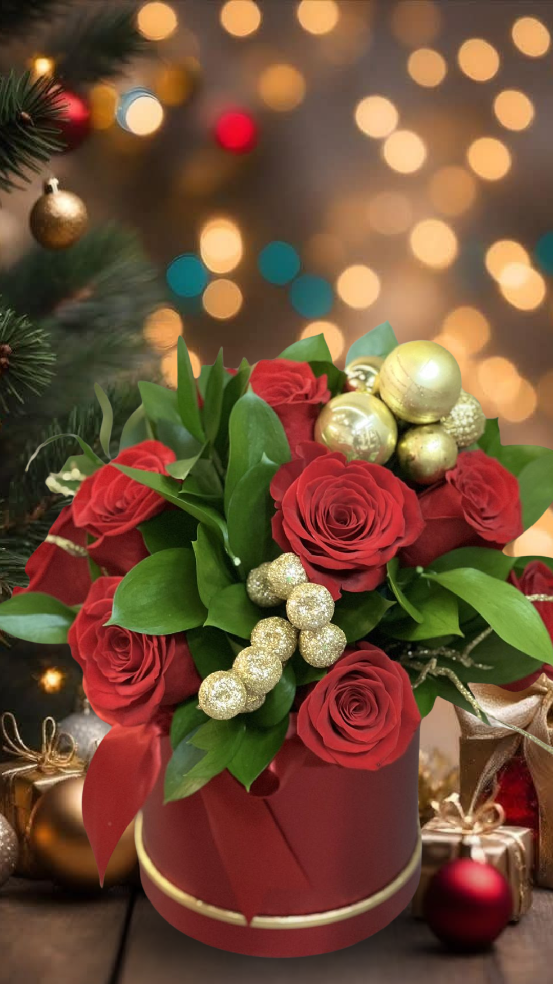 La Gala de Nochebuena es una composición floral sofisticada que captura la esencia mágica y acogedora de las fiestas decembrinas. Este arreglo se presenta en una base cilíndrica de color rojo intenso con detalles dorados, destacando por un conjunto de rosas rojas de terciopelo que simbolizan el amor y la calidez del hogar. El diseño se complementa con un follaje verde vibrante y está decorado con ornamentos festivos en tonos dorados que aportan un brillo elegante y festivo. Es el obsequio perfecto para decorar la mesa familiar o para enviar un deseo de prosperidad y alegría a los seres queridos, ofreciendo una estética clásica que ilumina cualquier rincón durante la Navidad.