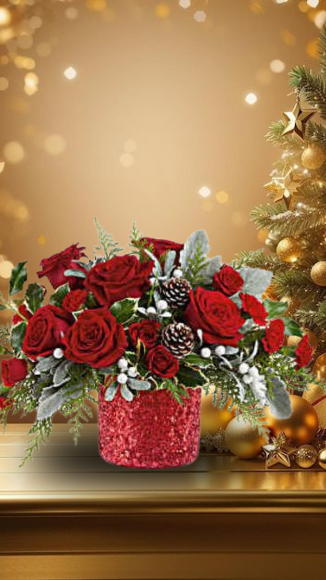 El arreglo Rocío de Navidad es una pieza de lujo diseñada para capturar el espíritu vibrante y tradicional de las fiestas. Esta imponente composición se presenta en una base cilíndrica con un acabado brillante de color carmesí, destacando por un conjunto de rosas rojas de gran apertura que evocan elegancia y calidez. El diseño se complementa con detalles de piñas de pino, follaje verde invernal y acentos plateados que simulan la frescura de la nieve. Es el obsequio ideal para embellecer cualquier espacio durante las festividades, ofreciendo una combinación visual clásica que transmite alegría y buenos deseos a familiares y amigos.