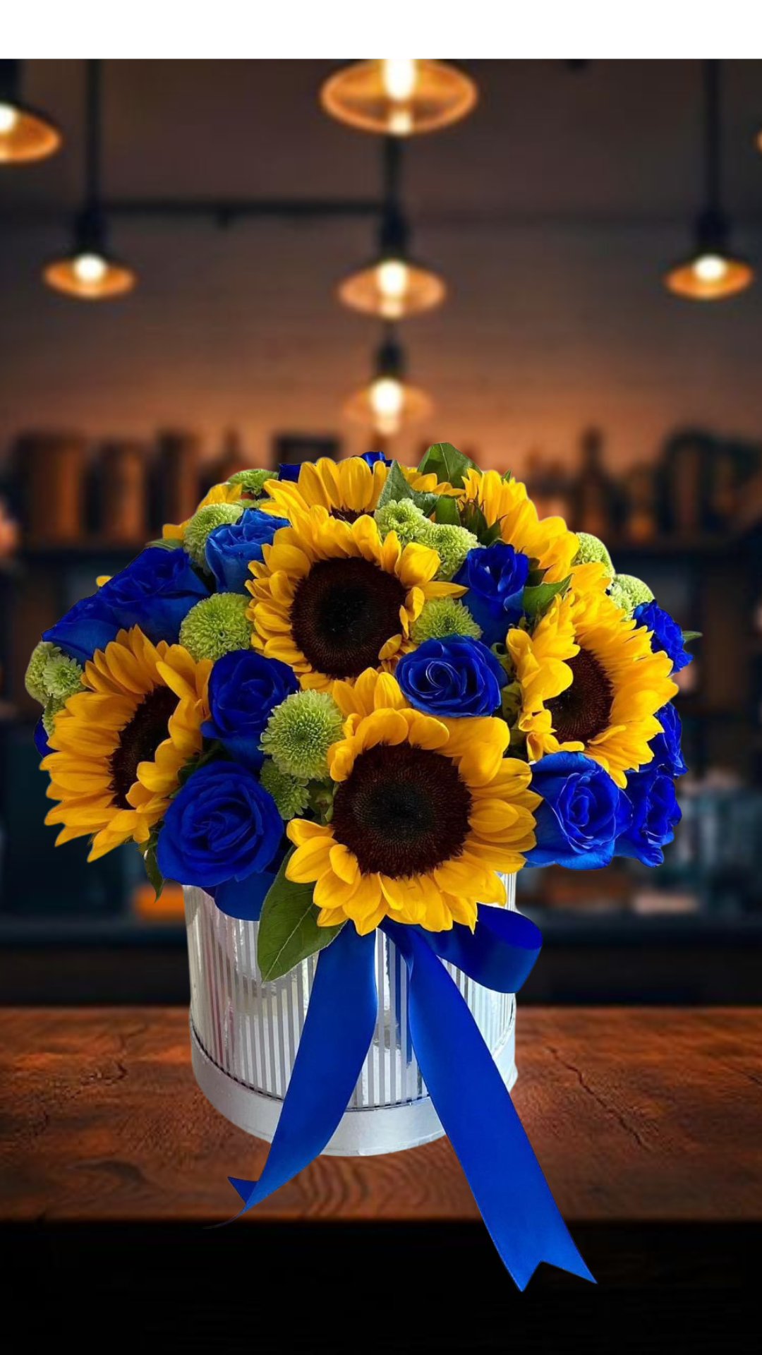 La Armonía de Contraste es un arreglo floral vibrante y lleno de significado, que irradia fuerza y optimismo. Este impactante box combina la energía y alegría de los girasoles grandes y radiantes con la profundidad y distinción de las rosas azules, un color que simboliza la confianza y la admiración. Los toques de flores verdes añaden frescura y volumen. Presentado en una elegante caja cilíndrica blanca y adornado con un llamativo lazo azul, es el regalo perfecto para celebrar logros importantes, el espíritu indomable o para enviar un mensaje de apoyo y esperanza con un estilo único.