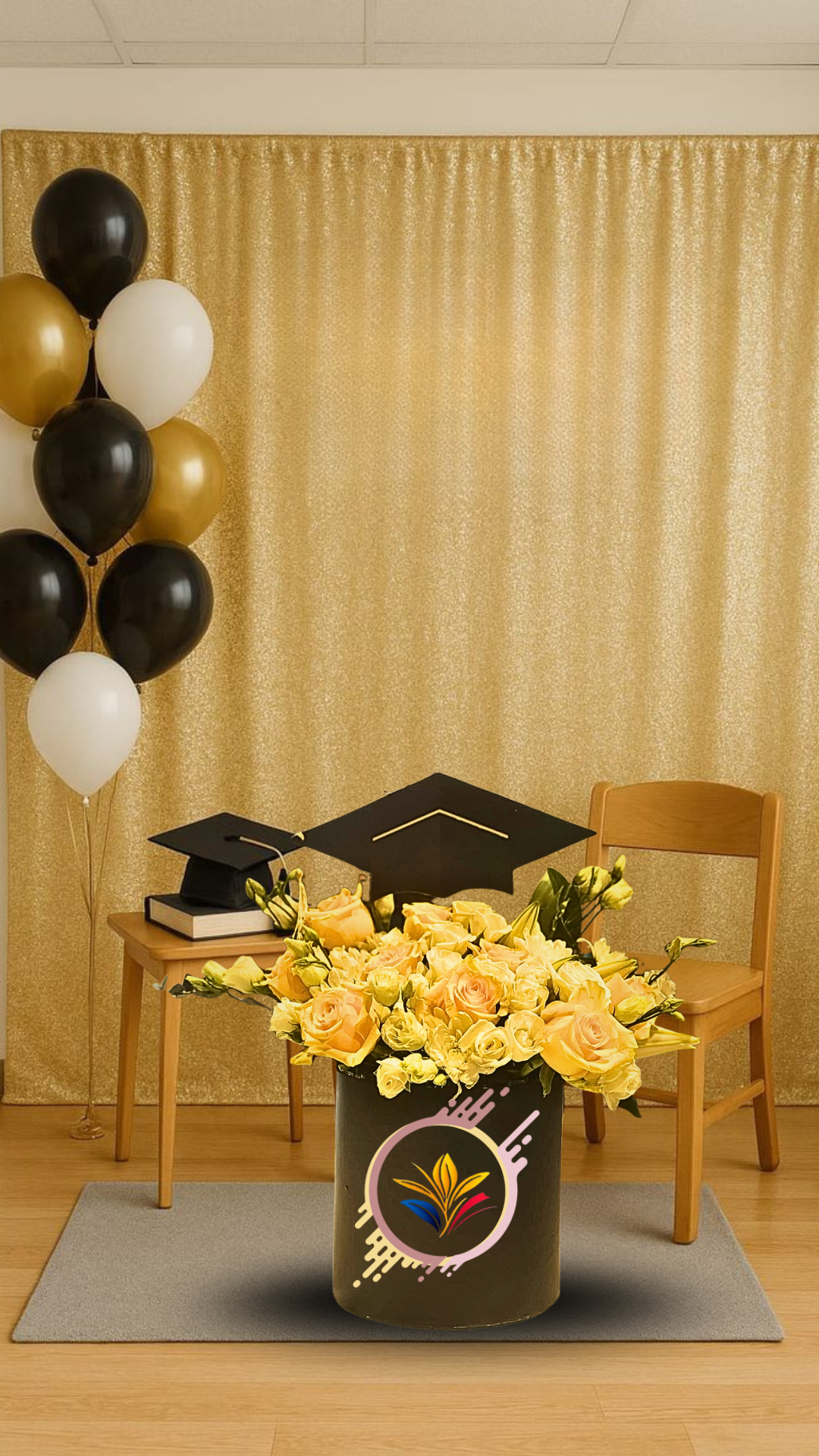 Futuro Dorado es el arreglo de celebración que captura la emoción y el optimismo de un nuevo comienzo. Este box bajo y elegante está repleto de rosas amarillas, que simbolizan el éxito, la alegría y la amistad, perfectas para celebrar este gran logro. El arreglo está complementado con lirios amarillos y, como toque festivo, se incluyen sutiles birretes de graduación. Presentado en una elegante caja negra, es el regalo ideal para graduaciones que buscan transmitir un mensaje de felicidad, éxito y un futuro radiante con un toque de sofisticación.
