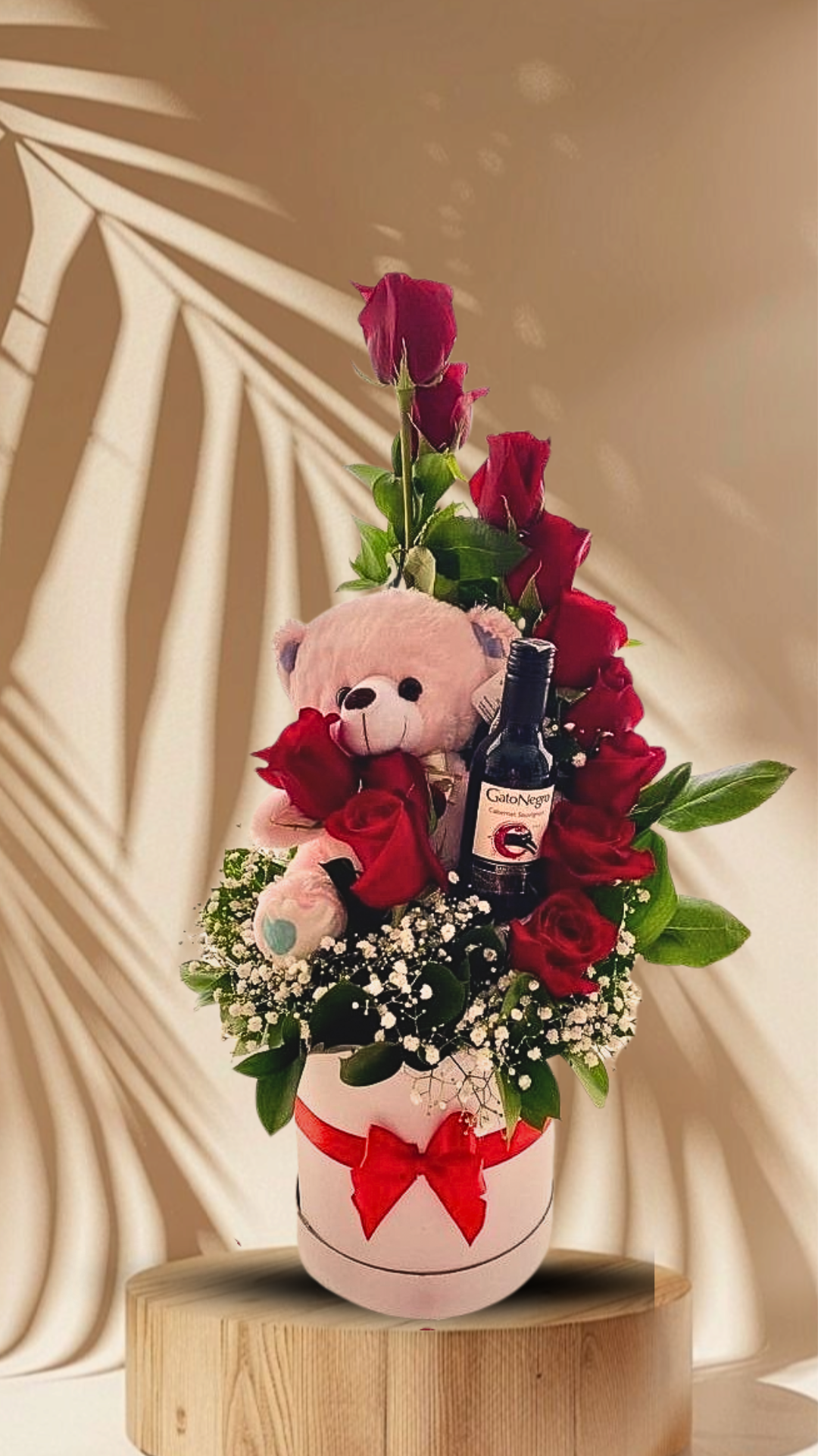 El Abrazo del Brindis es el regalo perfecto para conquistar corazones con ternura y un toque romántico. Este encantador arreglo presenta un tierno oso de peluche que se asoma entre un abundante bouquet de rosas rojas vibrantes, símbolos del amor profundo, y delicada gipsofilia. El toque para celebrar lo aporta una mini botella de vino Gato Negro, ideal para un brindis íntimo. Todo ello dispuesto en una elegante caja redonda blanca con un lazo rojo, es el detalle ideal para aniversarios, San Valentín o para expresar un «te quiero» de la forma más dulce y memorable.