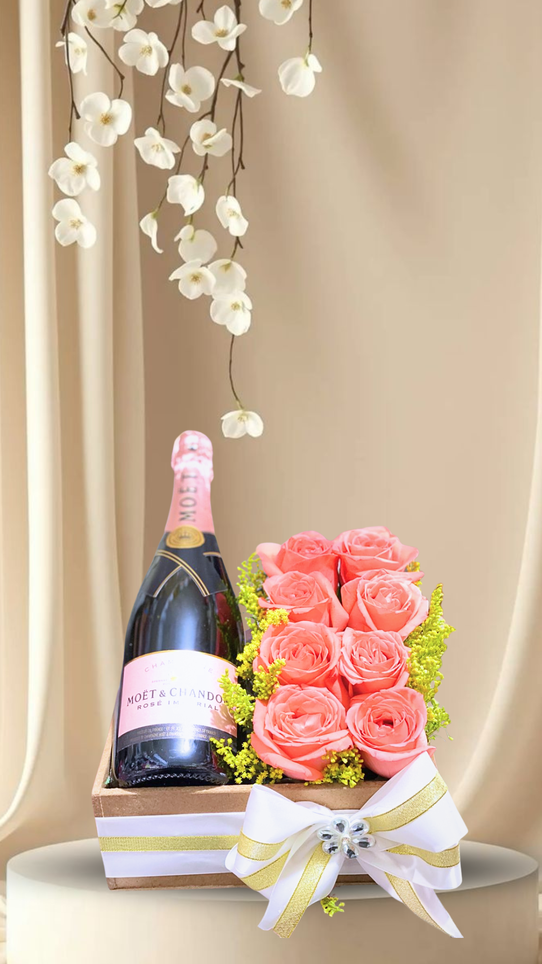 El set Brindis de Lujo Rosado es la forma más sofisticada de conmemorar un logro o una fecha especial. Combina la elegancia efervescente de una botella de Moët & Chandon Rosé Imperial, el ícono de la celebración, con la belleza suave y optimista de un arreglo de rosas en tono coral o salmón con toque de follaje verde limón. Presentado en una rústica pero chic caja de madera y adornado con un gran lazo blanco y dorado, este regalo es la opción ideal para aniversarios románticos, ascensos laborales o para desear prosperidad con un toque de distinción y sabor.