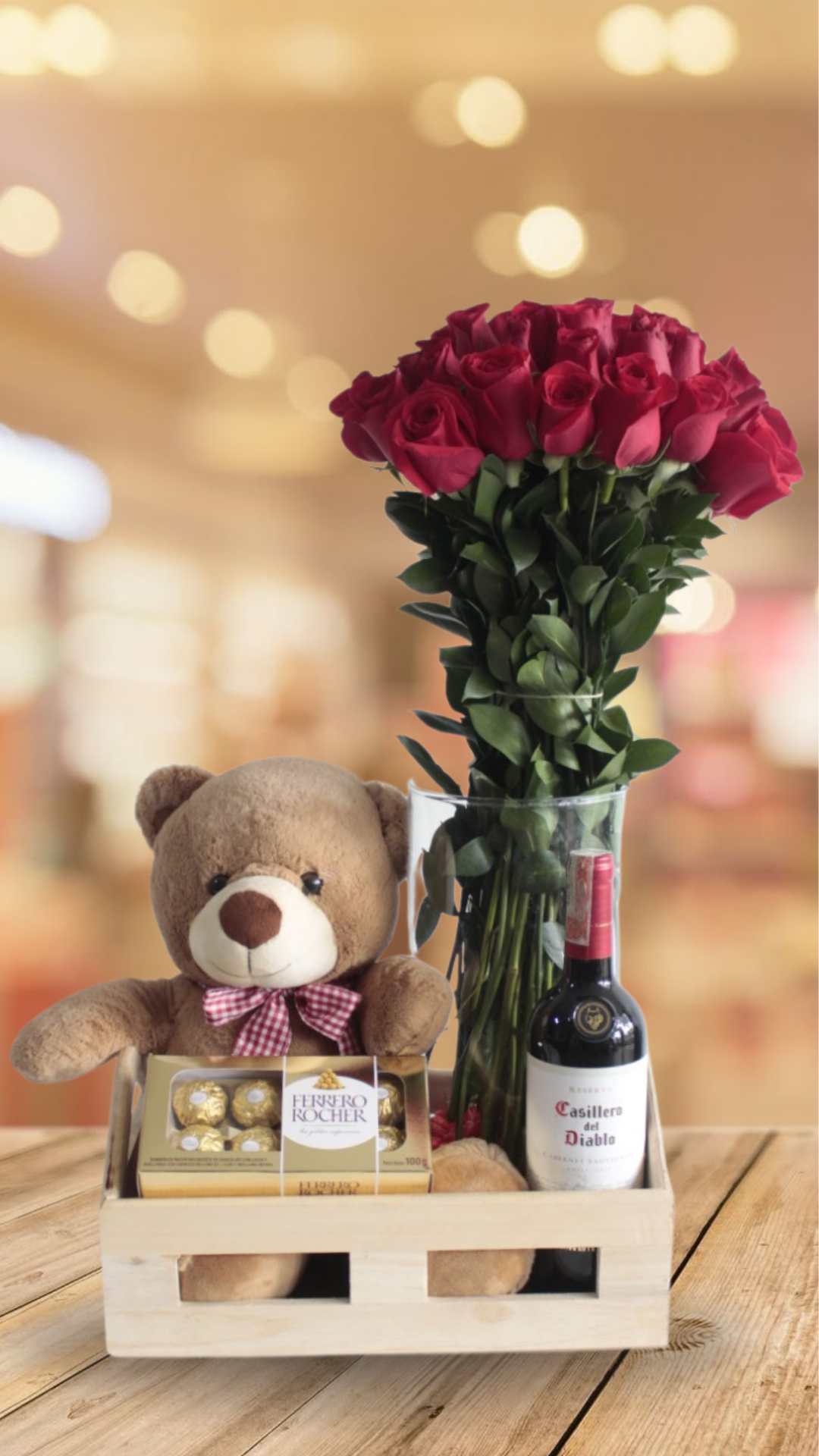El Bouquet del Corazón y Tentación es la declaración de amor definitiva, combinando los regalos más deseados en un solo paquete espectacular. Este set de lujo incluye un majestuoso ramo de rosas rojas frescas, símbolo eterno de pasión; un tierno oso de peluche para abrazar; la dulzura inconfundible de los chocolates Ferrero Rocher, y una botella de vino Casillero del Diablo para el brindis perfecto. Presentado en una elegante caja de madera, es el regalo completo y sofisticado ideal para aniversarios, cumpleaños, o para decir «Te Amo» de la manera más memorable.