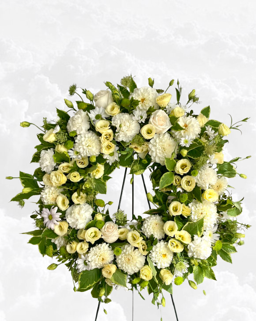 La Corona Jardín de la Paz es un tributo floral sereno y reconfortante, diseñado para honrar la memoria del ser querido. Este diseño circular simboliza el amor infinito y la vida eterna, y está compuesto por una mezcla suave de flores blancas y crema, incluyendo rosas y margaritas. El abundante follaje verde limón y oscuro aporta vida y frescura al arreglo. Presentada en un caballete, es una ofrenda floral elegante y sutil, ideal para expresar respeto, consuelo y acompañamiento a la familia en su momento de duelo.