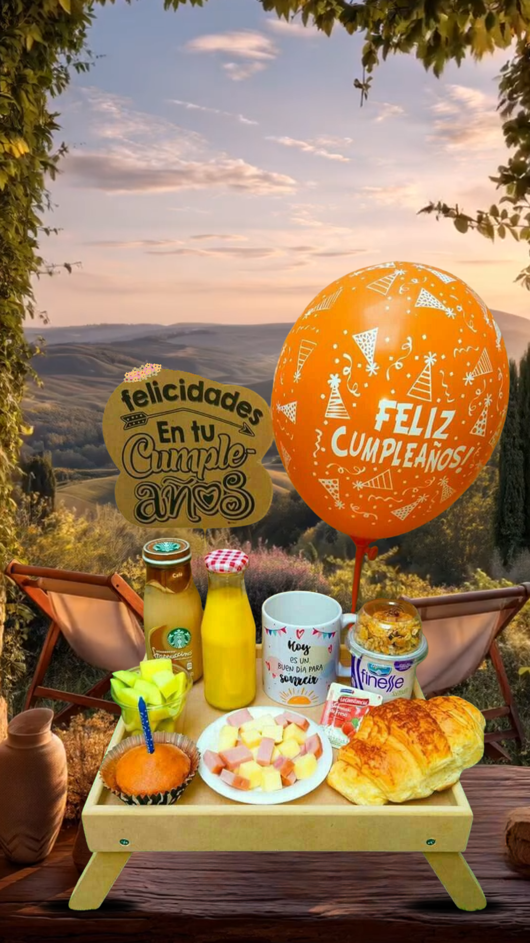 El Amanecer del Cumpleañero es la forma perfecta de iniciar un día especial con alegría y sabor. Este completo desayuno sorpresa se presenta en una encantadora mini mesa de picnic rústica e incluye una selección de productos frescos y listos para disfrutar, además de porciones de fruta fresca y queso y jamón en cubos. Se complementa con un yogur con granola y una taza con un mensaje motivador. El toque festivo lo da un gran globo de «Feliz Cumpleaños» en color naranja. Es un regalo inolvidable, ideal para sorprender a un ser querido y hacer de su cumpleaños una mañana espectacular.
