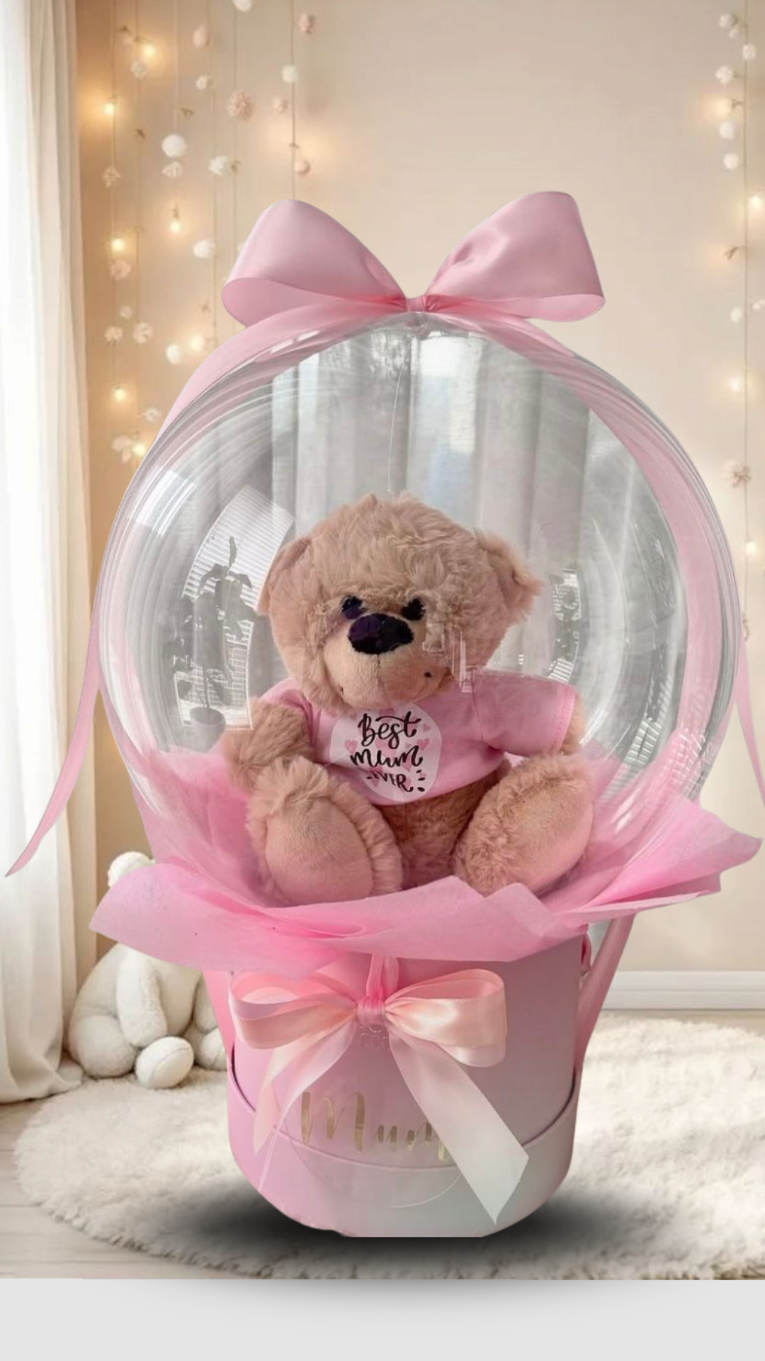 La Burbuja de Cariño Rosado es un regalo mágico e inolvidable, perfecto para expresar amor y ternura. Este obsequio destaca por su presentación única: un tierno oso de peluche elegantemente confinado en un globo transparente y esférico. El globo está adornado con un gran lazo rosado de satén y se apoya en una caja cilíndrica rosada, que sirve como base. Es el detalle ideal para celebrar cumpleaños, aniversarios, o simplemente para enviar un gesto de afecto de forma duradera y con una presentación de cuento.