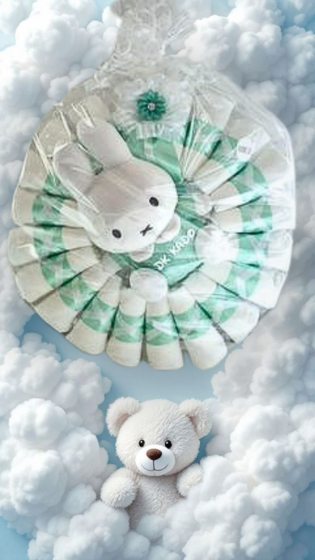 El detalle Arrullo entre Nubes es un regalo encantador y funcional, diseñado para celebrar la llegada de una nueva vida con delicadeza. Esta pieza creativa presenta un tierno peluche de conejo integrado en una estructura circular que simula un carrusel, elaborada con elementos esenciales para el cuidado del bebé en tonos verde menta y blanco. El conjunto viene protegido en un empaque transparente con un lazo artesanal y se presenta sobre un fondo de nubes esponjosas que resaltan su dulzura. Es la opción ideal para un Baby Shower o una visita al recién nacido, ofreciendo un detalle que combina la utilidad con una estética soñadora y mágica que los padres atesorarán.