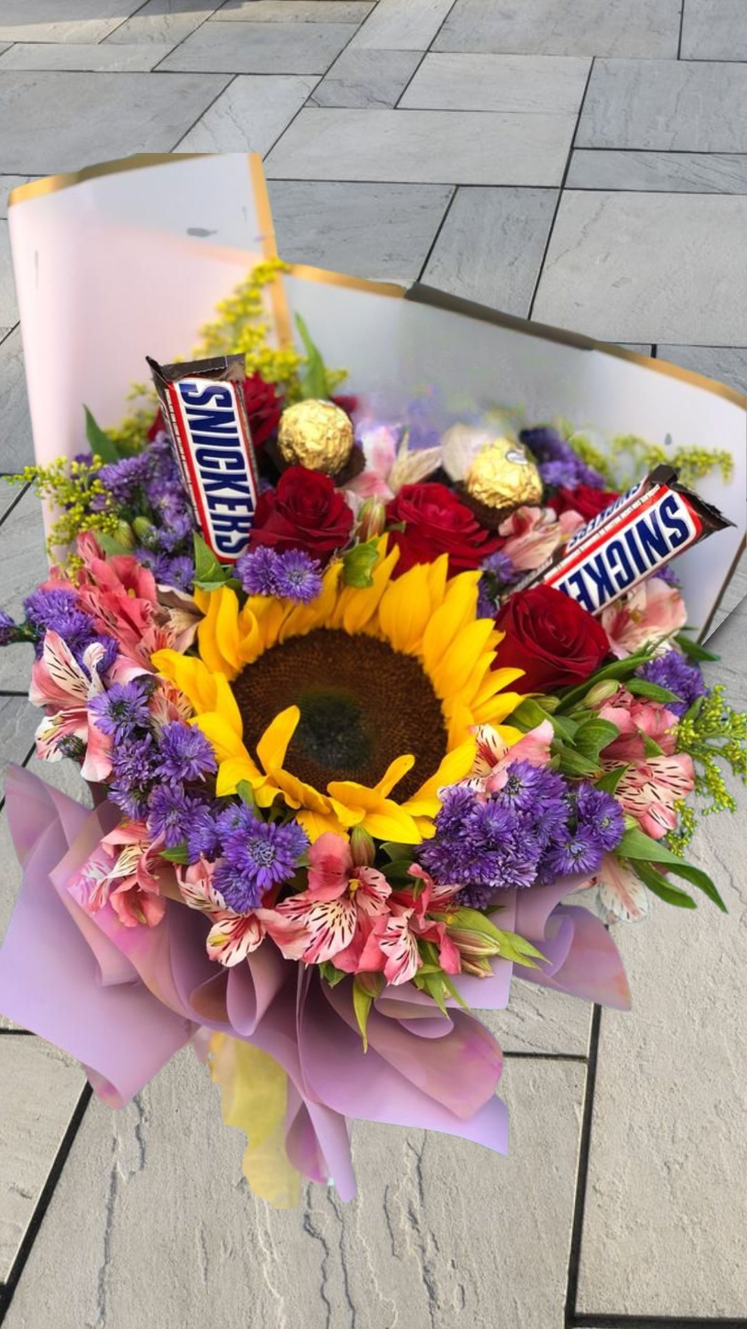 La Explosión de Alegría y Sabor es un regalo vibrante y lleno de personalidad, diseñado para levantar el ánimo y deleitar el paladar. Este dinámico ramo combina la luz radiante de un girasol central con la pasión de las rosas rojas, la vivacidad de las flores moradas y rosadas, y delicados follajes. El toque divertido y delicioso lo aportan los chocolates Snickers y Ferrero Rocher estratégicamente colocados. Envuelto con un papel en tonos pastel, es el detalle perfecto para celebrar cumpleaños, enviar un «ánimo» o simplemente sorprender con una mezcla única de belleza floral y dulce indulgencia.