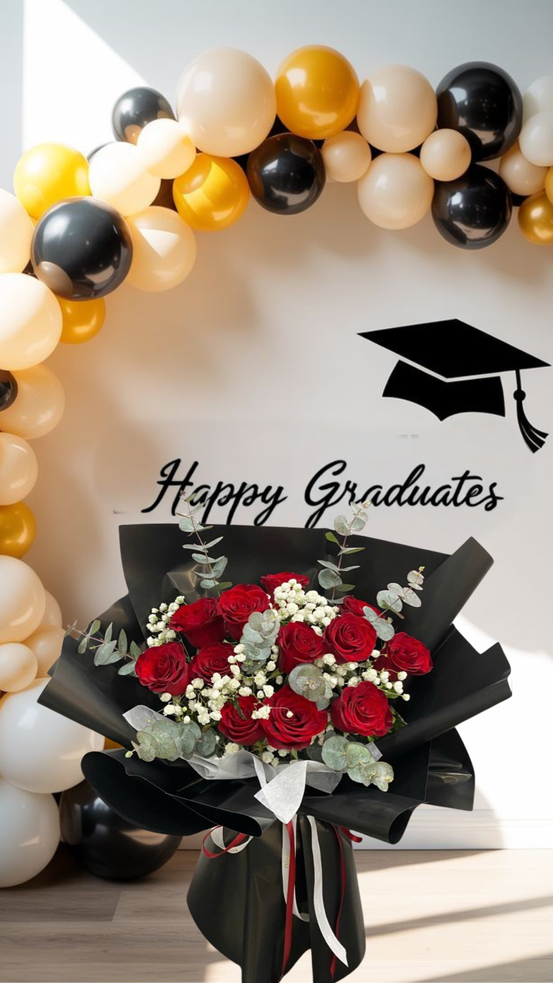 El Ramo de Honor y Pasión es el tributo floral más elegante para conmemorar el gran logro de la graduación. Este ramo impactante presenta una composición de rosas rojas vibrantes, que simbolizan el amor, el respeto y la culminación exitosa. Las flores están enmarcadas por la delicadeza de la gipsofilia y el toque moderno de hojas de eucalipto. Envuelto en un sofisticado papel negro mate y complementado con un lazo blanco y negro, es el detalle perfecto para felicitar a un graduado y augurarle un futuro lleno de pasión y logros.
