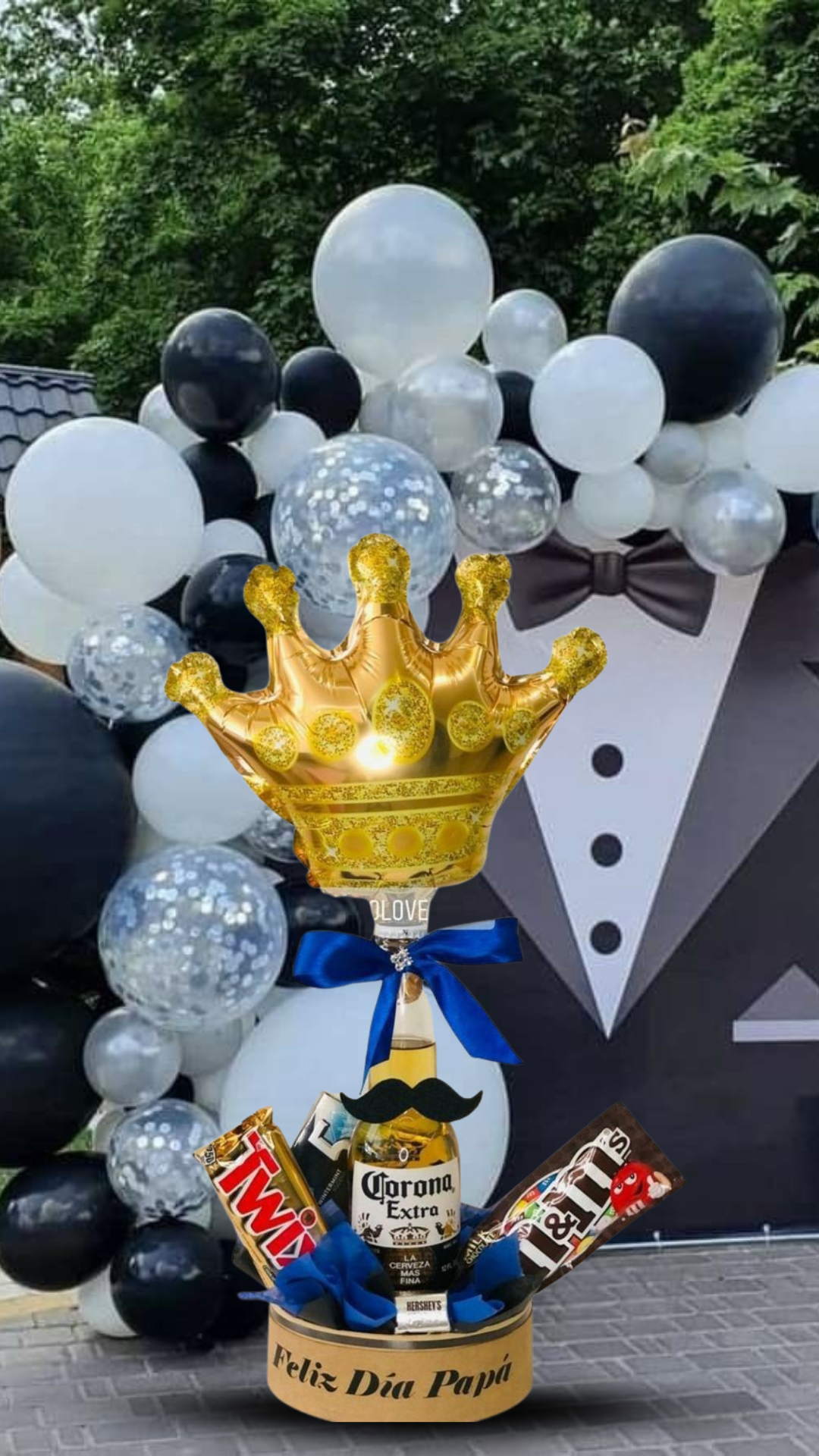 El Rey de la Casa es un detalle audaz y festivo diseñado para rendir homenaje a papá con un toque de distinción y alegría. Este regalo destaca por una base circular que contiene una selección de snacks de marcas reconocidas y una bebida refrescante decorada con un simpático detalle de bigote. El arreglo es coronado por un espectacular globo metálico en forma de corona dorada, complementado con lazos de satén en azul profundo. Todo el conjunto se presenta sobre un fondo temático de gala con globos en blanco, negro y plata, convirtiéndose en el obsequio ideal para celebrar el Día del Padre con un estilo único que resalta su importancia en la familia.