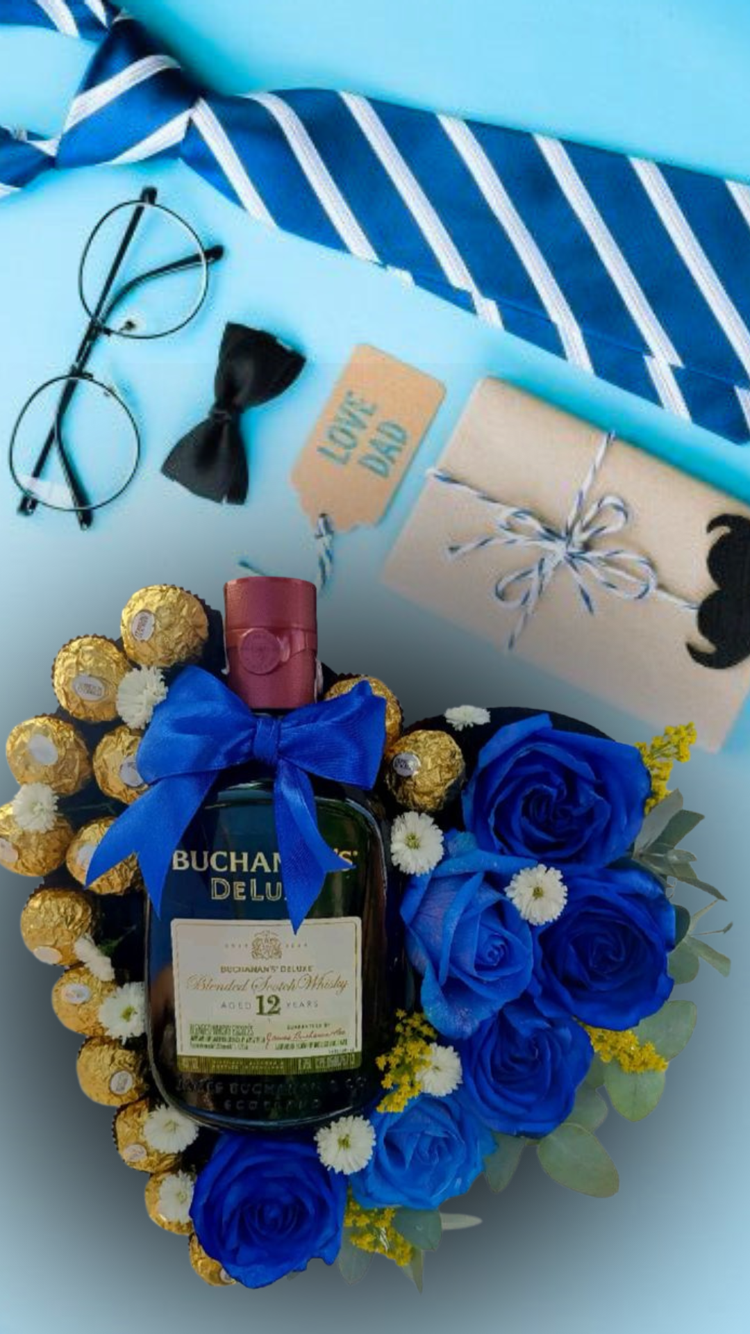 El detalle Corazón de Oro y Roble es una expresión de lujo y afecto, diseñada para celebrar la elegancia y el gusto refinado de papá. Este obsequio se presenta en una sofisticada base con forma de corazón que integra armoniosamente una selección de bombones de chocolate con un arreglo de rosas en azul profundo y follaje delicado. En el centro destaca una botella de whisky de alta gama, decorada con un lazo de satén a juego que resalta su distinción. Es el regalo ideal para homenajear a papá en su día, ofreciendo una experiencia sensorial que combina dulzura, carácter y belleza visual.