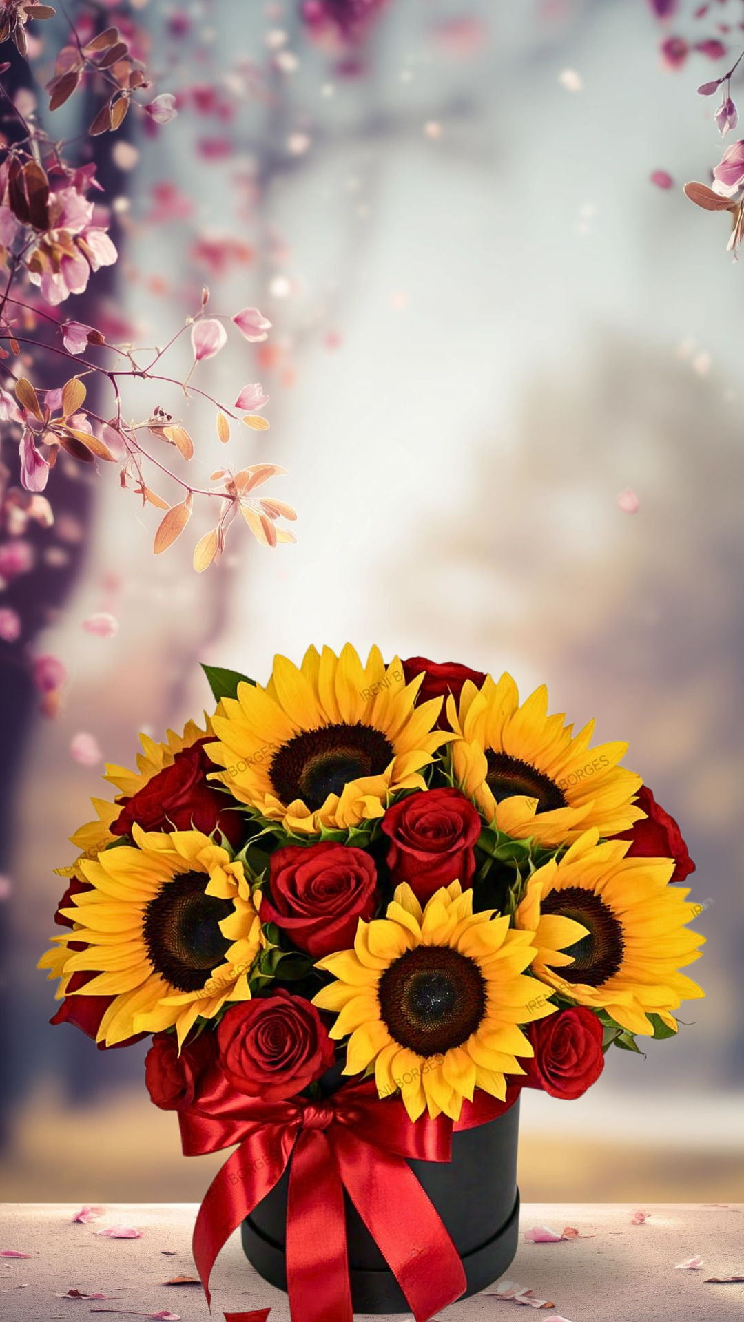 El detalle Rayo de Sol y Pasión es una pieza floral impactante que combina la calidez del sol con la fuerza del amor maternal. Este diseño de lujo se presenta en una base cilíndrica de color negro profundo, creando un contraste moderno con la vibrante selección de girasoles de pétalos dorados. Entre ellos, emergen rosas rojas aterciopeladas que añaden una nota de romance y elegancia clásica a la composición. Un gran lazo de satén carmesí abraza la base, sellando con distinción este obsequio que irradia alegría y admiración. Es el regalo perfecto para llenar de luz el día de mamá, recordándole que ella es el centro de nuestro universo.
