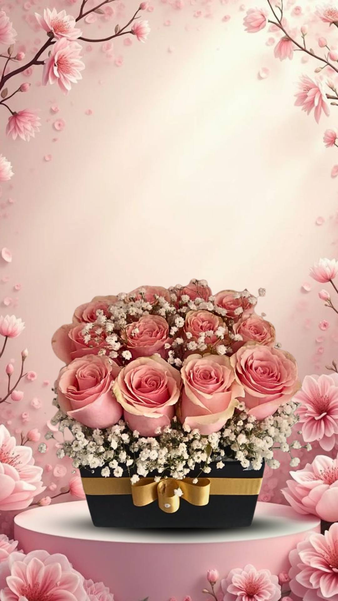El arreglo Elegancia en Rosa es una oda a la feminidad y la distinción. Presentado en una moderna box rectangular de color negro azabache, este diseño crea un contraste perfecto con el tono rosa pastel de sus rosas. Las flores, seleccionadas por su apertura perfecta, están delicadamente entrelazadas con una abundante nube de baby’s breath blanco, que aporta una textura ligera y etérea. El toque final de lujo lo da un brillante lazo de satén dorado con un detalle de pedrería en el centro, elevando la presentación a un nivel de alta gama. Ambientado en un entorno de flores de cerezo, es el regalo ideal para expresar gratitud y ternura a una mujer especial en su día, envolviéndola en una atmósfera de pura sofisticación.