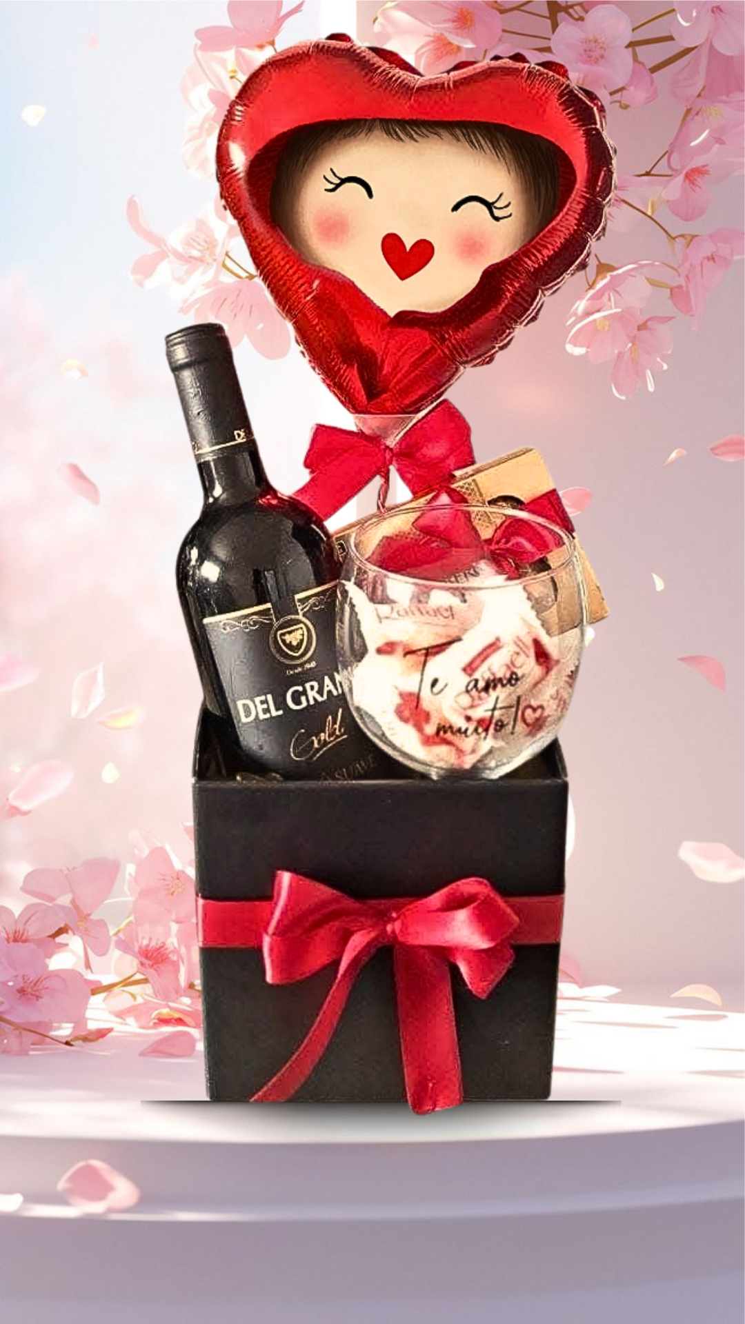 El detalle Brindis de Gracia y Dulzura es una experiencia de regalo diseñada para cautivar y celebrar la esencia única de la mujer. Presentado en una elegante box negra mate con un lazo de seda rojo, este set combina la distinción de un vino Del Grano Gold con detalles que roban sonrisas. Destaca una copa personalizada llena de delicados bombones, acompañada de un elemento de diseño único: un globo metalizado en forma de corazón con un adorable rostro animado que irradia felicidad. Es el obsequio perfecto para reconocer a una mujer auténtica y soñadora, ofreciéndole un momento de relax y dulzura en un día tan especial como el suyo.