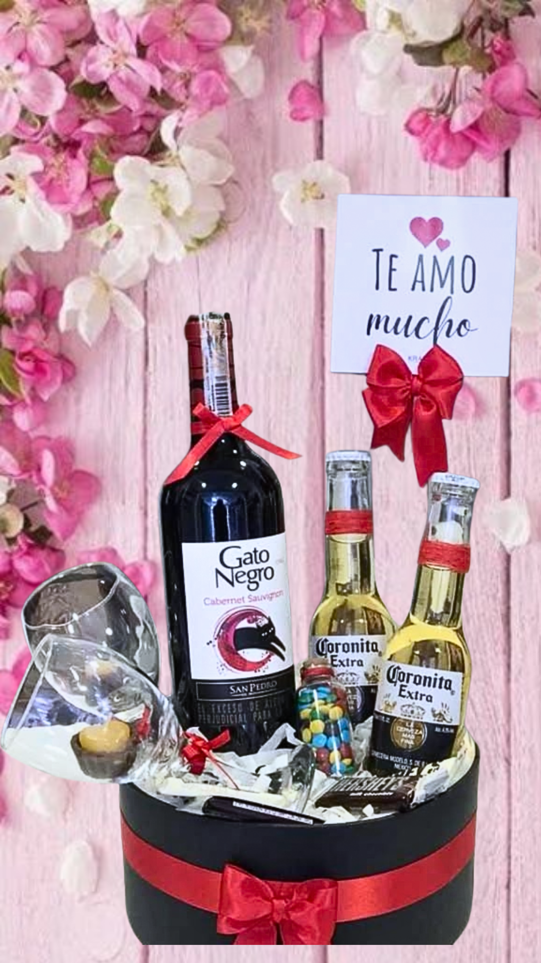 El detalle Cofre Brindis de Libertad es una experiencia de regalo diseñada para cautivar todos los sentidos. Presentado en una sofisticada base circular negra mate con un lazo de satén carmesí, este arreglo rompe los esquemas tradicionales. Incluye un icónico vino Gato Negro Cabernet Sauvignon para los momentos de reflexión y dos cervezas Coronita Extra para refrescar el espíritu, acompañadas de copas de cristal y una selección de dulces para compartir. El toque final lo aporta una tarjeta personalizada con el mensaje «Te Amo Mucho», rodeada de un entorno floral rosa que suaviza la fuerza del diseño. Es la elección perfecta para celebrar a una mujer auténtica en su día, brindando por su fuerza, su alegría y su invaluable presencia en nuestras vidas.