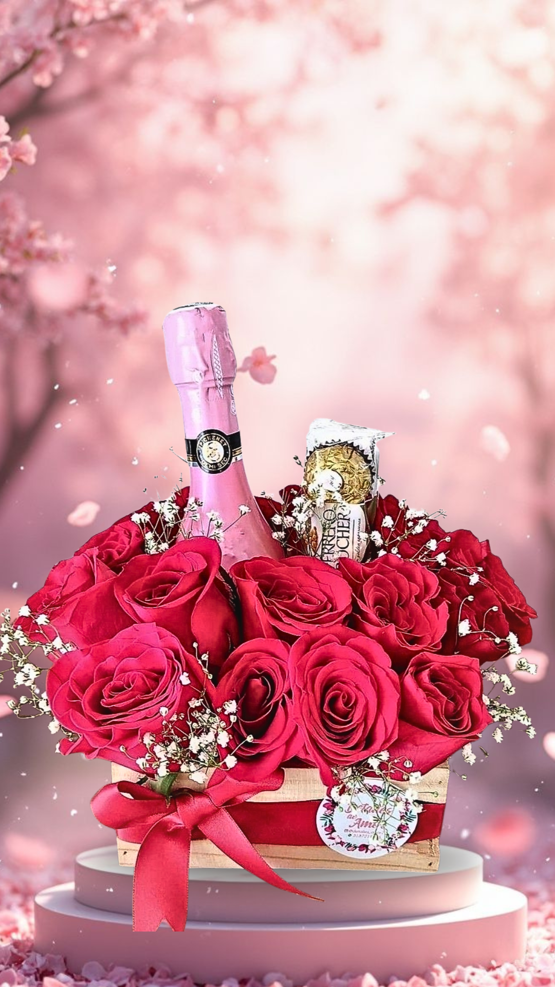 El detalle Burbujas de Empoderamiento es una celebración vibrante diseñada para rendir homenaje a la mujer con estilo y distinción. Este exclusivo arreglo se presenta en una canasta de madera artesanal, decorada con un lazo de satén carmesí y una etiqueta personalizada. En su corazón, destaca una botella de espumoso rosado que invita a un brindis por los logros y la esencia femenina, acompañada de una selección de chocolates Ferrero Rocher para un toque de dulzura premium. Todo el conjunto está abrazado por un denso bouquet de rosas rojas aterciopeladas y delicados destellos de baby’s breath blanco. Presentado sobre un pedestal en un entorno de pétalos flotantes, es el regalo perfecto para reconocer a una mujer extraordinaria con un detalle que irradia alegría y sofisticación.